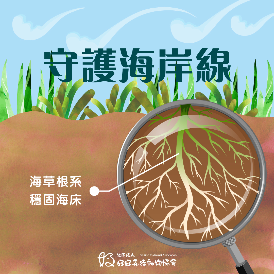 海草的根系能穩固海床,減少海浪造成的侵蝕,
