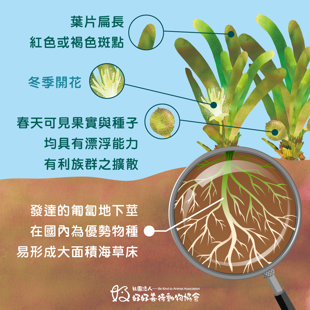 它是台灣分布最廣、最具代表性的海草之一,也是許多海洋生物的家園。