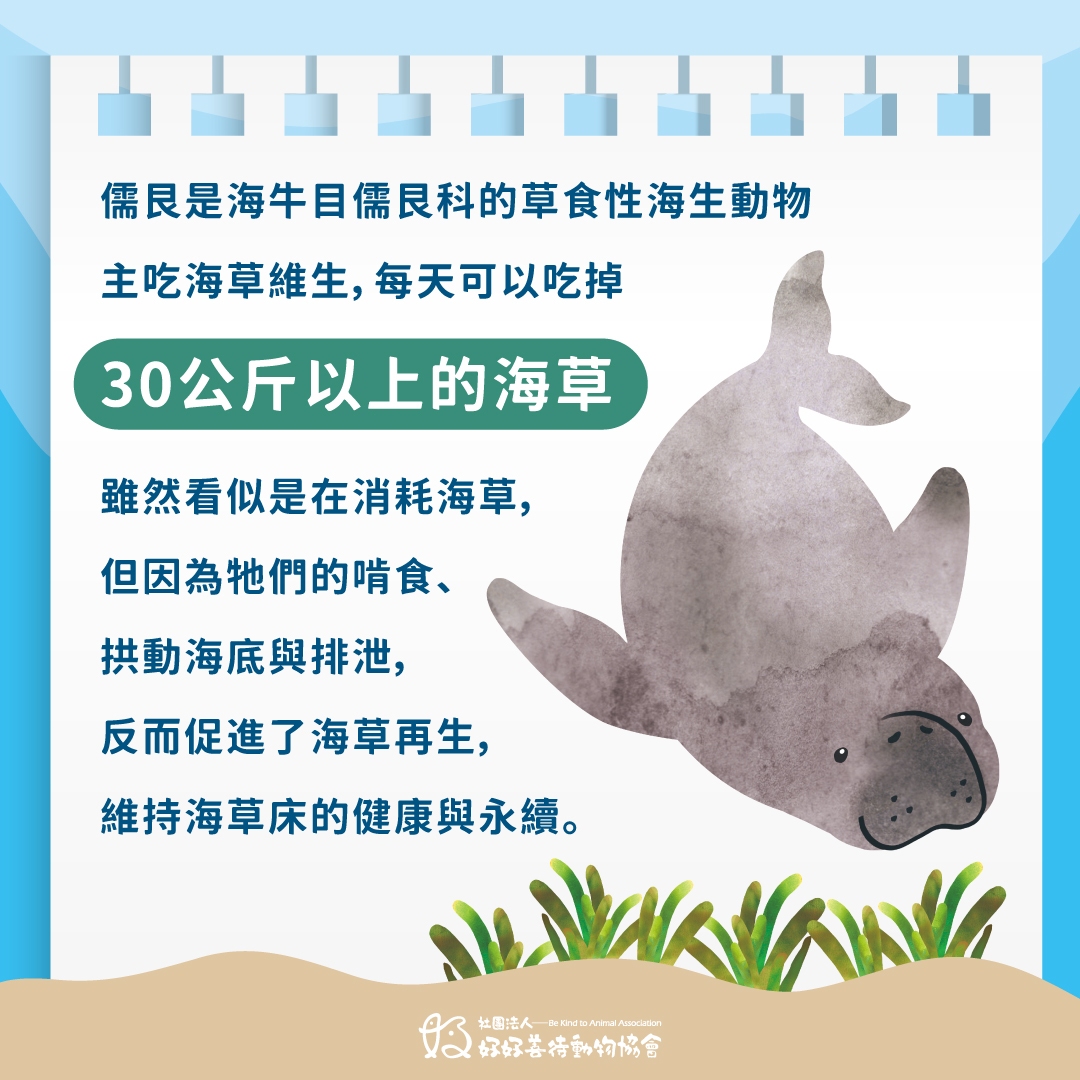 牠們會像修剪草坪一樣啃食海草,讓海草床更健康;也會拱動海底、讓海水流動、更透光;牠們的排泄物甚至成了天然肥料。有儒艮的地方,海草床就更有生命力。