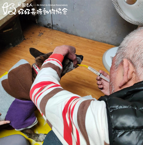 愛爸清楚醫療回診是園區很大的負擔,因此買入老犬營養品,每天自己按時餵食投藥,讓老浪孩維持身體健康,能有更多時間在園區自由地生活